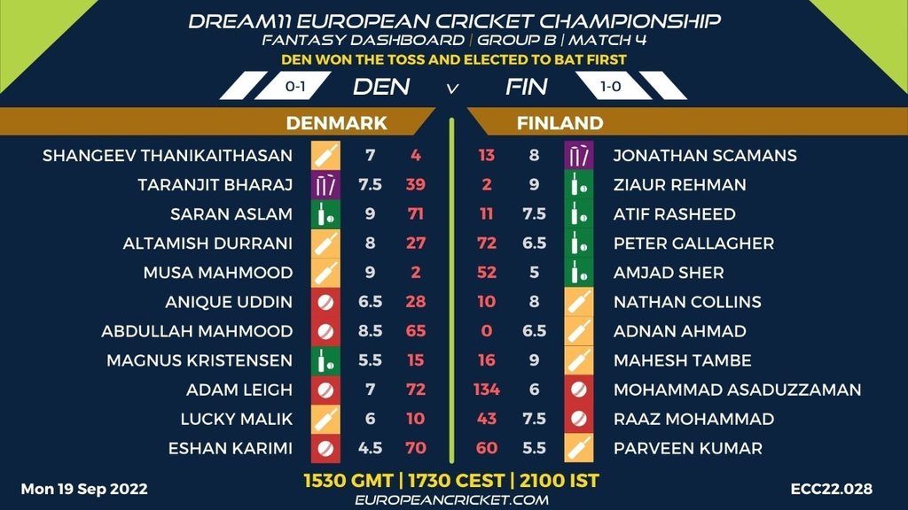 GROUP B, MATCH 4 (ECC22.028) DENMARK (DEN) v FINLAND (FIN) 1530 GMT | 1730 CEST | 2100 IST