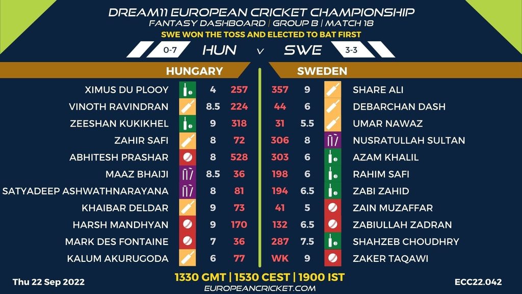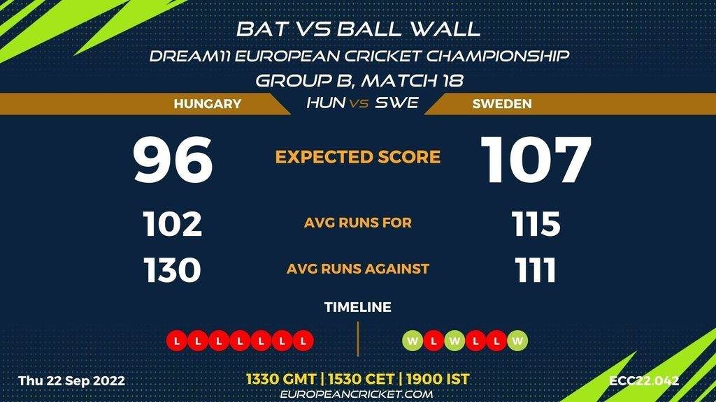 GROUP B, MATCH 18 (ECC22.042) HUNGARY (HUN) v SWEDEN (SWE) 1330 GMT | 1530 CEST | 1900 IST