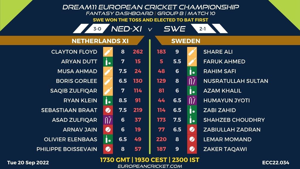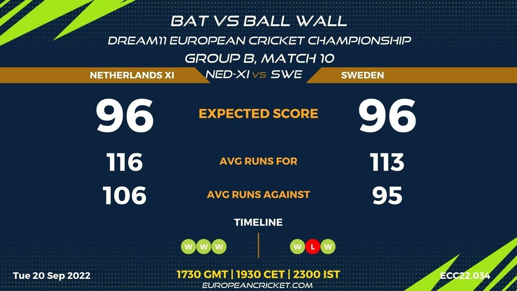 GROUP B, MATCH 10 (ECC22.034) NETHERLANDS XI (NED-XI) v SWEDEN (SWE) 1730 GMT | 1930 CEST | 2300 IST