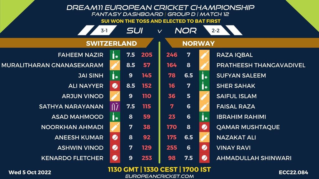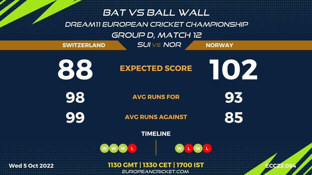 GROUP D, MATCH 12 (ECC22.084) SWITZERLAND (SUI) v NORWAY (NOR) 1130 GMT | 1330 CEST | 1700 IST