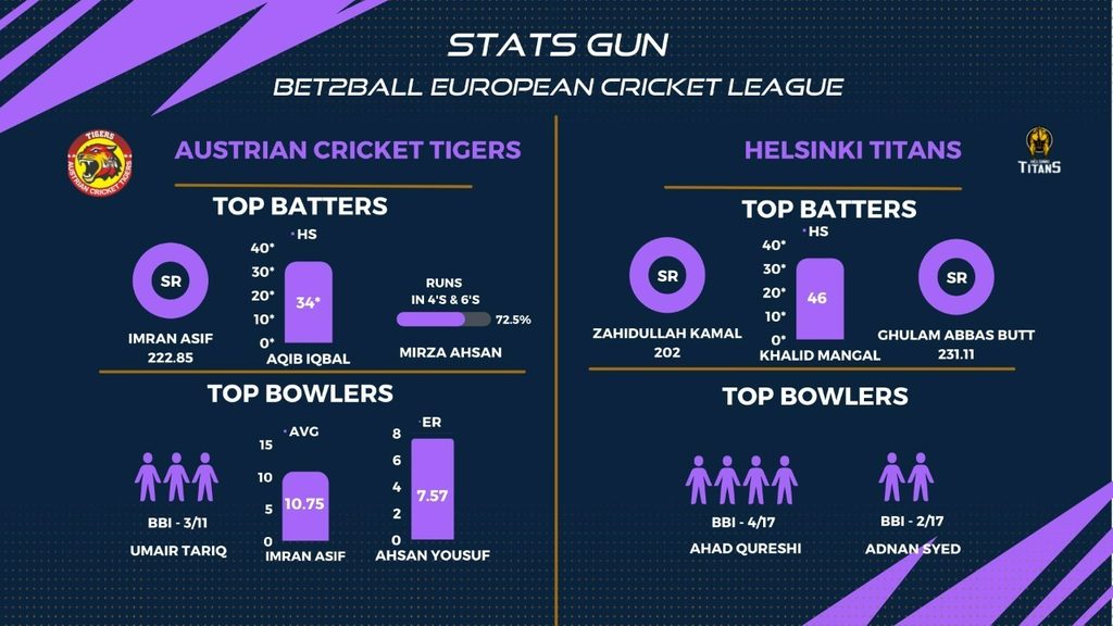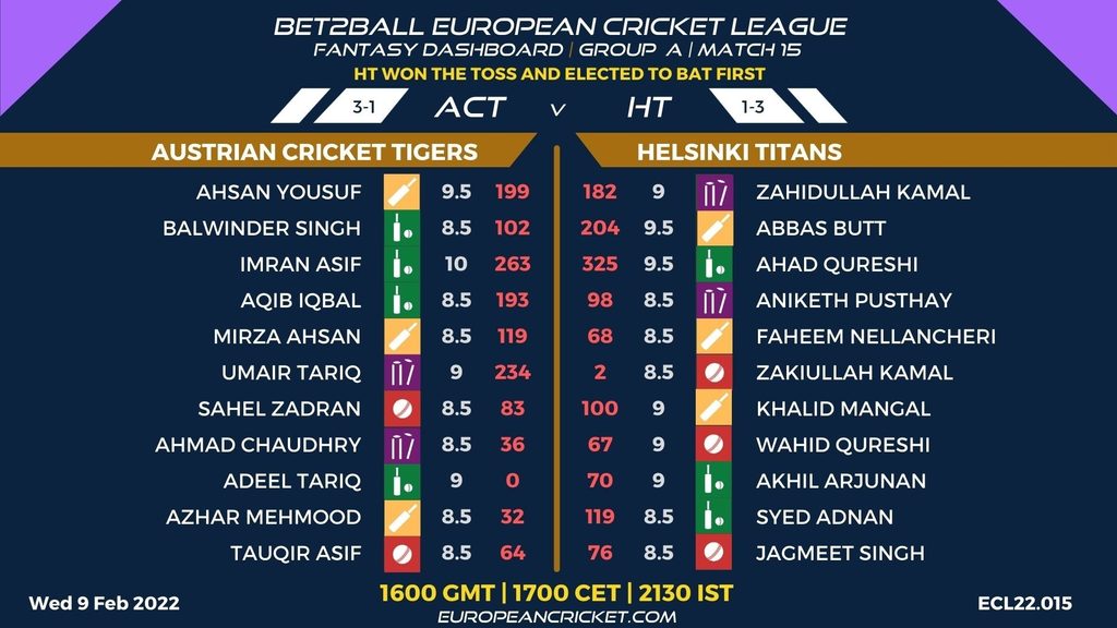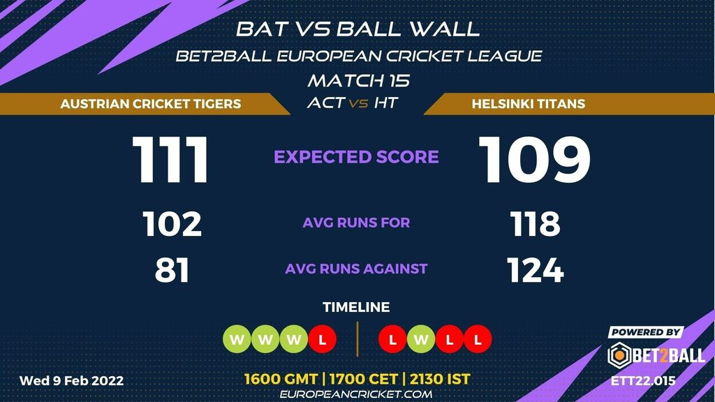 MATCH 5 (ECL22.015) AUSTRIAN CRICKET TIGERS (ACT) v HELSINKI TITANS (HT) 1600 GMT | 1700 CET | 2130 IST