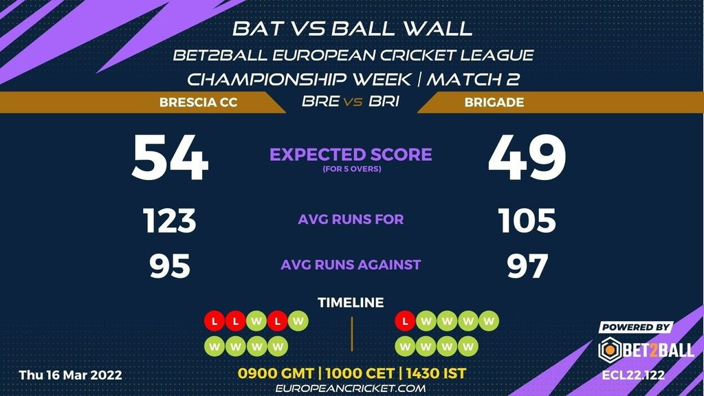 MATCH 2 (ECL22.122) BRESCIA CC (BRE) v BRIGADE (BRI) 0900 GMT | 1000 CET | 1430 IST