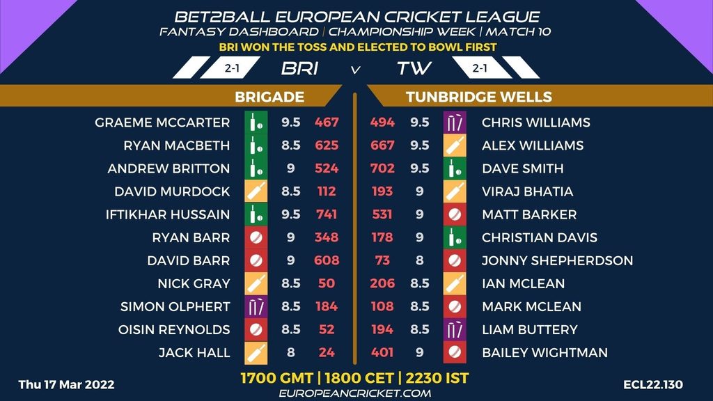 MATCH 10 (ECL22.130) BRIGADE (BRI) v TUNBRIDGE WELLS (TW) 1700 GMT | 1800 CET | 2230 IST