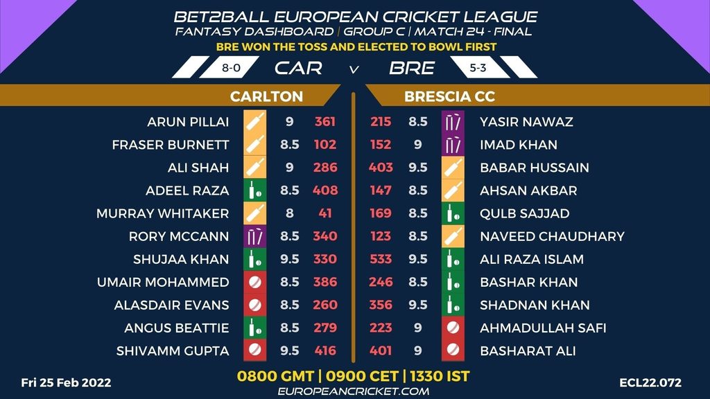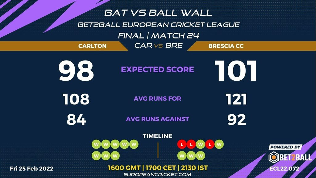 FINAL - MATCH 24 (ECL22.072) CARLTON (CAR) v BRESCIA CC (BRE) 1600 GMT | 1700 CET | 2130 IST