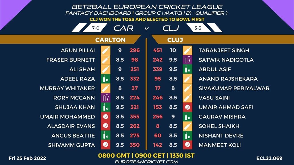 QUALIFIER 1 - MATCH 21 (ECL22.069) CARLTON (CAR) v CLUJ (CLJ) 0800 GMT | 0900 CET | 1330 IST