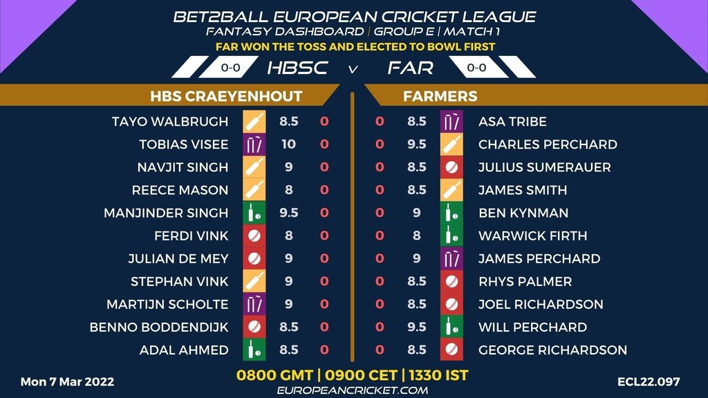 MATCH 1 (ECL22.097) HBS CRAEYENHOUT (HBSC) v FARMERS (FAR) 0800 GMT | 0900 CET | 1330 IST