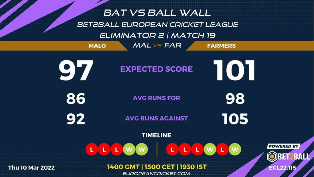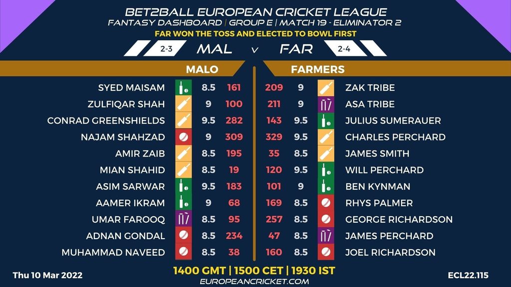 ELIMINATOR 2 - MATCH 19 (ECL22.115) MALO (MAL) v FARMERS (FAR) 1400 GMT | 1500 CET | 1930 IST
