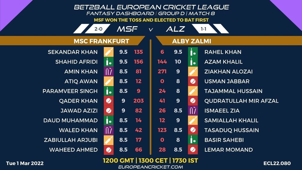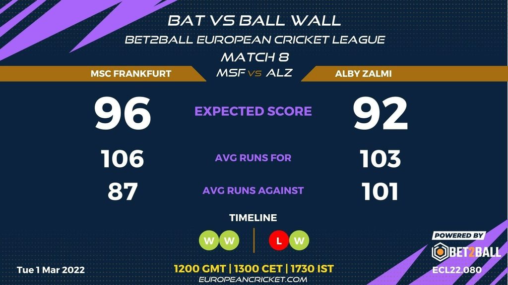 MATCH 8 (ECL22.080) MSC FRANKFURT (MSF) v ALBY ZALMI (ALZ) 1200 GMT | 1300 CET | 1730 IST