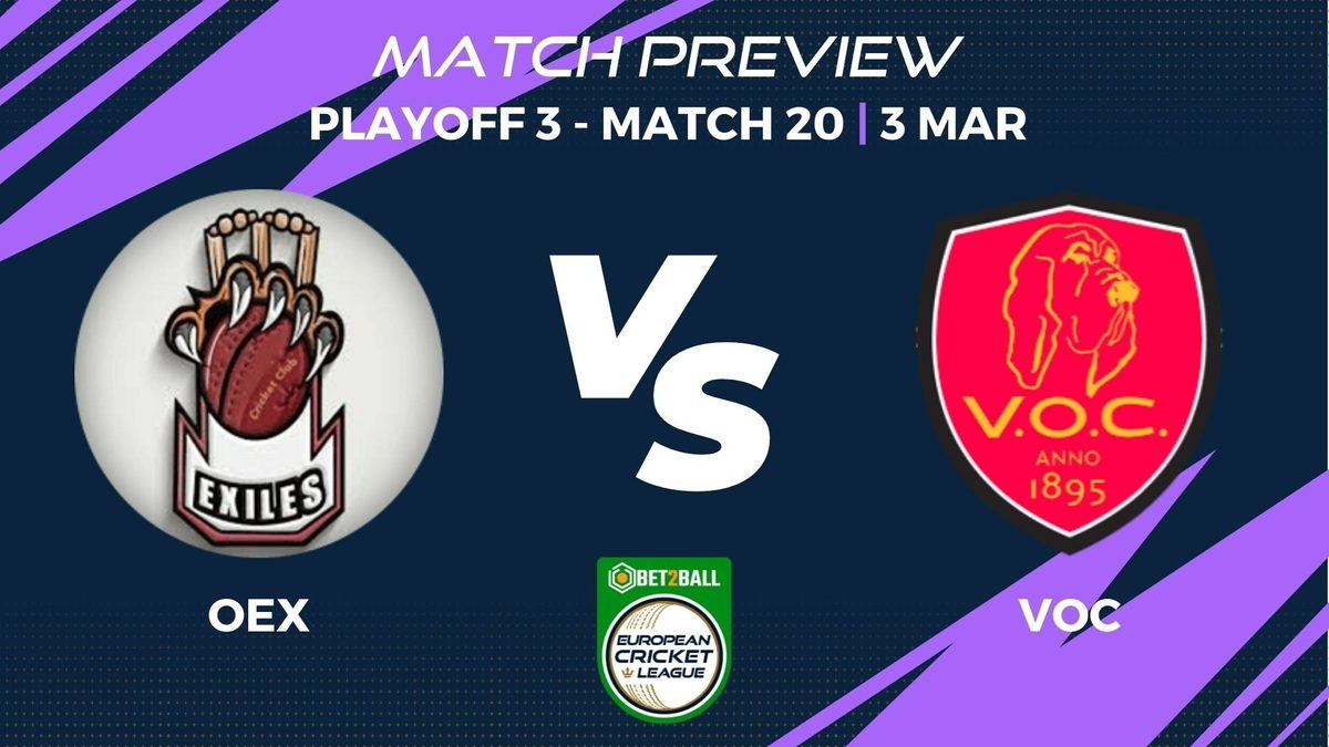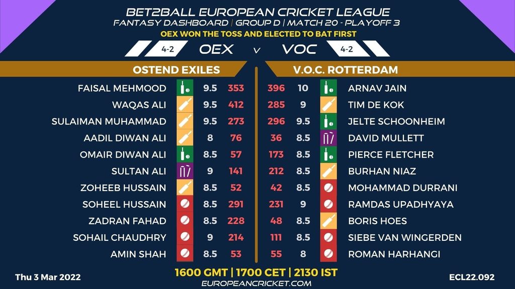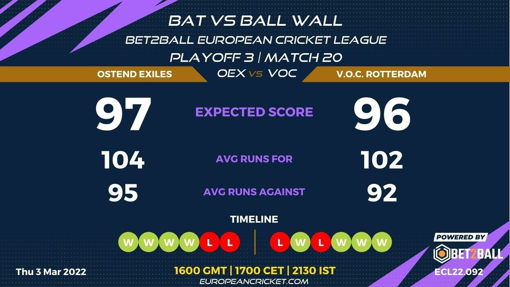 PLAYOFF 3 - MATCH 20 (ECL22.092) OSTEND EXILES (OEX) v V.O.C. ROTTERDAM (VOC) 1600 GMT | 1700 CET | 2130 IST