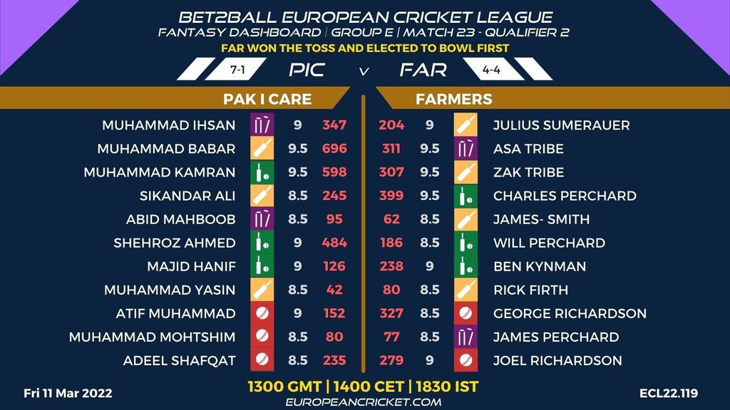 QUALIFIER 2 - MATCH 23 (ECL22.119) PAK I CARE BADALONA (PIC) v FARMERS (FAR) 1300 GMT | 1400 CET | 1830 IST