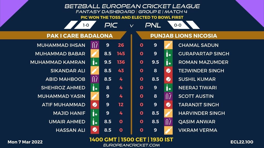MATCH 4 (ECL22.100) PAK I CARE BADALONA (PIC) v PUNJAB LIONS NICOSIA (PNL) 1400 GMT | 1500 CET | 1930 IST