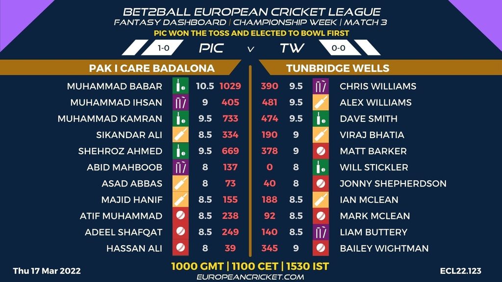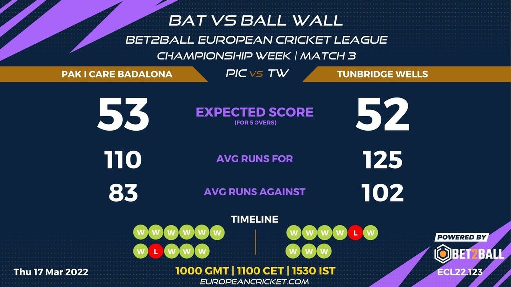 MATCH 3 (ECL22.123) PAK I CARE BADALONA (PIC) v TUNBRIDGE WELLS (TW) 1000 GMT | 1100 CET | 1530 IST