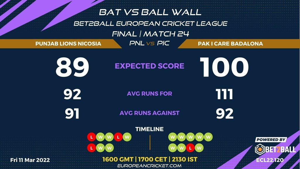 FINAL - MATCH 24 (ECL22.120) PUNJAB LIONS NICOSIA (PNL) v PAK I CARE BADALONA 1600 GMT | 1700 CET | 2130 IST