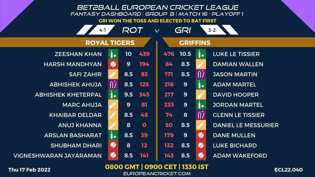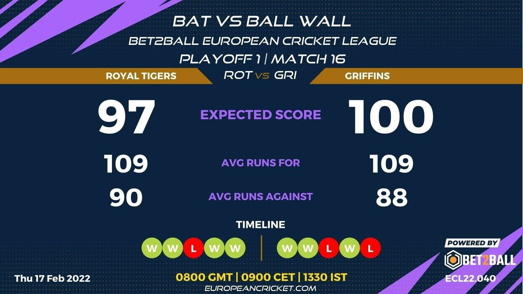 PLAYOFF 1 - MATCH 16 (ECL22.040) ROYAL TIGERS (ROT) v GRIFFINS (GRI) 0800 GMT | 0900 CET | 1330 IST