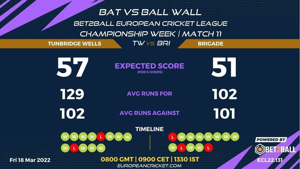 MATCH 11 (ECL22.131) TUNBRIDGE WELLS (TW) v BRIGADE (BRI) 0800 GMT | 0900 CET | 1330 IST