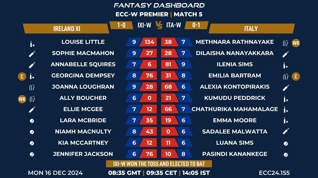 MATCH 5 (ECC24.155) IRELAND XI vs ITALY 08:35 GMT | 09:35 CET | 14:05 IST