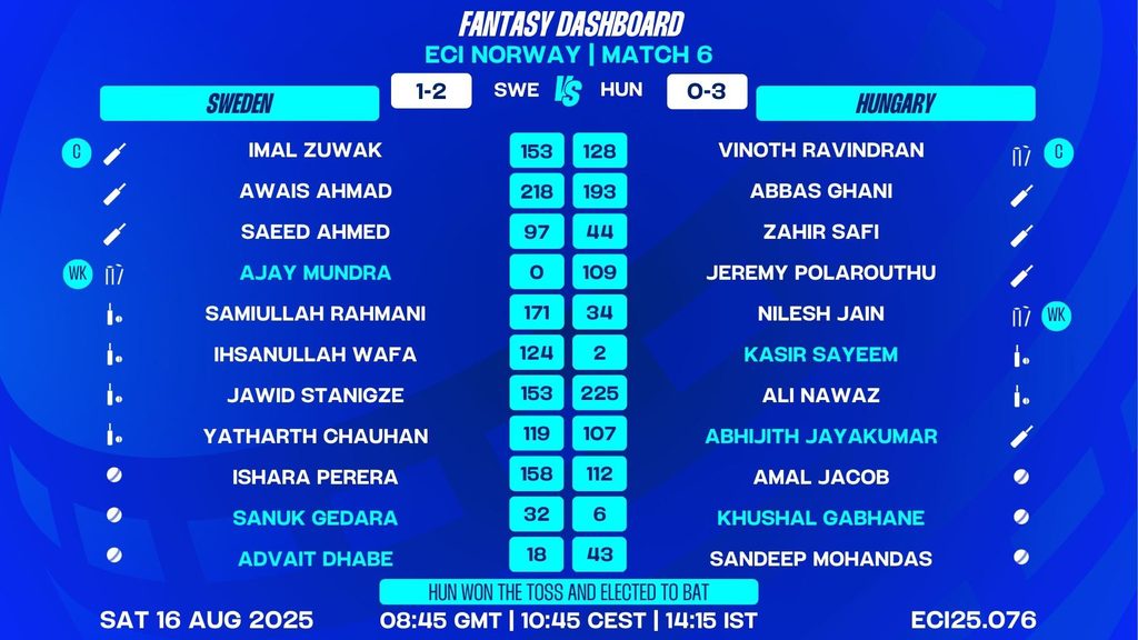 This match is set to be a battle of all-rounders and power-hitters. Sweden’s depth in all-rounders, led by Wafa and Rahmani, will be tested by Hungary’s explosive trio of Polarouthu, Nawaz, and Ravindran. The contest between Sweden’s disciplined bowling and Hungary’s aggressive batting could decide the outcome.