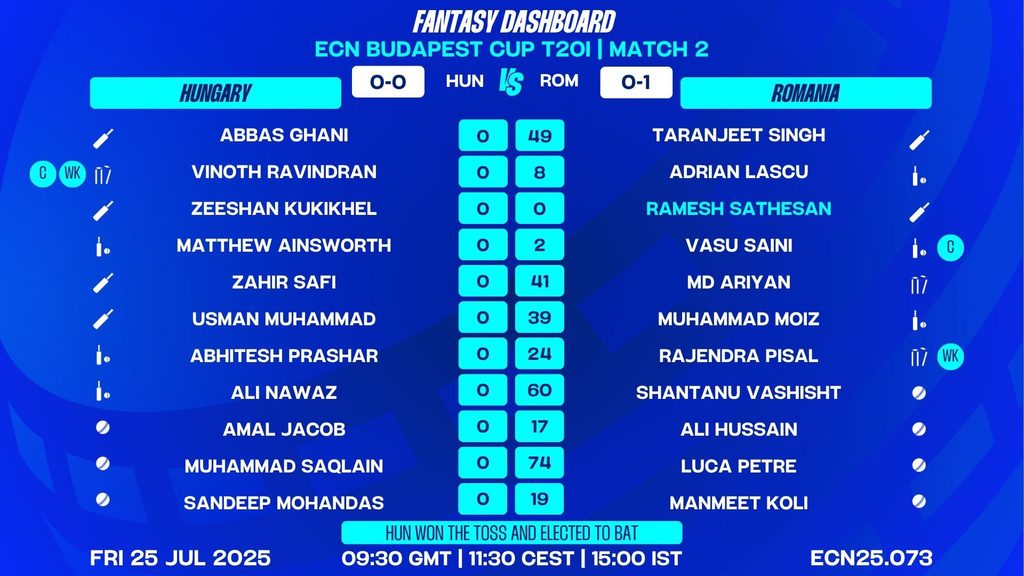 As the ECN Budapest Cup T20I, 2025 gets underway, all eyes turn to the second match of the opening day, where hosts Hungary take on a dynamic Romanian side at the GB Oval. With both teams boasting a blend of experience and explosive talent, this encounter promises high-octane action and pivotal moments.