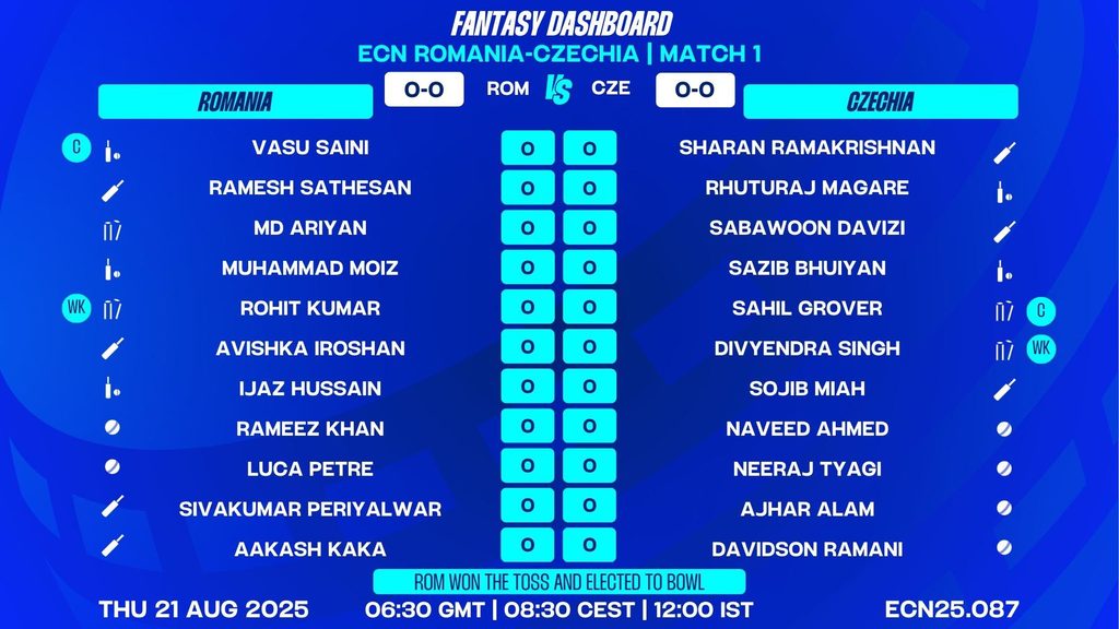 The 1st T20I of the ECN Romania-Czechia T20I, 2025 promises to be a thrilling contest between two evenly matched sides. With explosive batters, versatile all-rounders, and proven match-winners on both teams, fans can expect a fiercely competitive encounter at Moara Vlasiei Cricket Ground. Keep an eye on the all-rounders and power-hitters for both fantasy and on-field fireworks as Romania and Czechia kick off their campaigns in style.