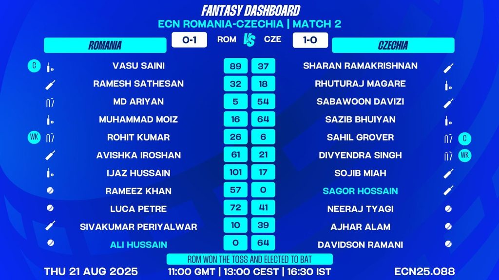 - Muhammad Moiz (ROM) vs Sazib Bhuiyan (CZE): Moiz’s 26.0 average runs per match and 2.0 sixes per match will be tested by Bhuiyan’s 20.0 average bowling fantasy points and ability to take multiple wickets in a match.