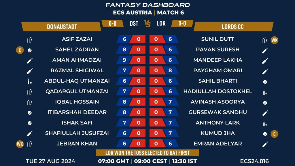MATCH 6 (ECS24.816) DONAUSTADT vs LORDS CC 07:00 GMT | 09:00 CEST | 12:30 IST