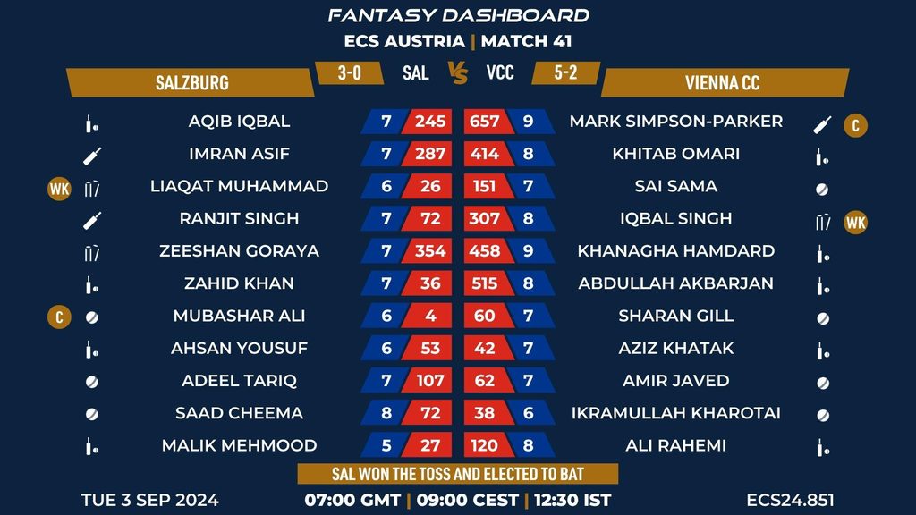 MATCH 41 (ECS24.851) SALZBURG vs VIENNA CC 07:00 GMT | 09:00 CEST | 12:30 IST