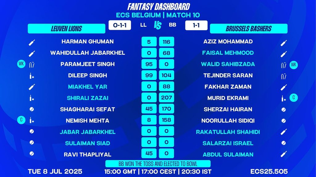 With both teams boasting explosive batters and crafty bowlers, Match 10 of ECS Belgium, 2025 is set for a thrilling contest at Stars Arena Hofstade. The Brussels Bashers’ decision to field first could set the tone, but the Leuven Lions’ top order, led by Wahidullah Jabarkhel, will be eager to make a statement. Expect fireworks, close matchups, and plenty of fantasy points on offer!