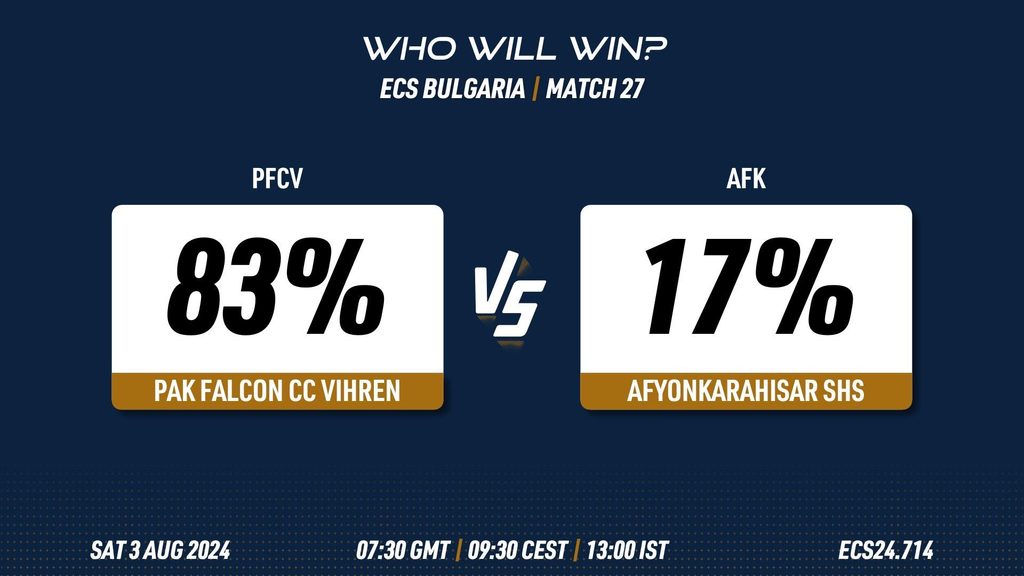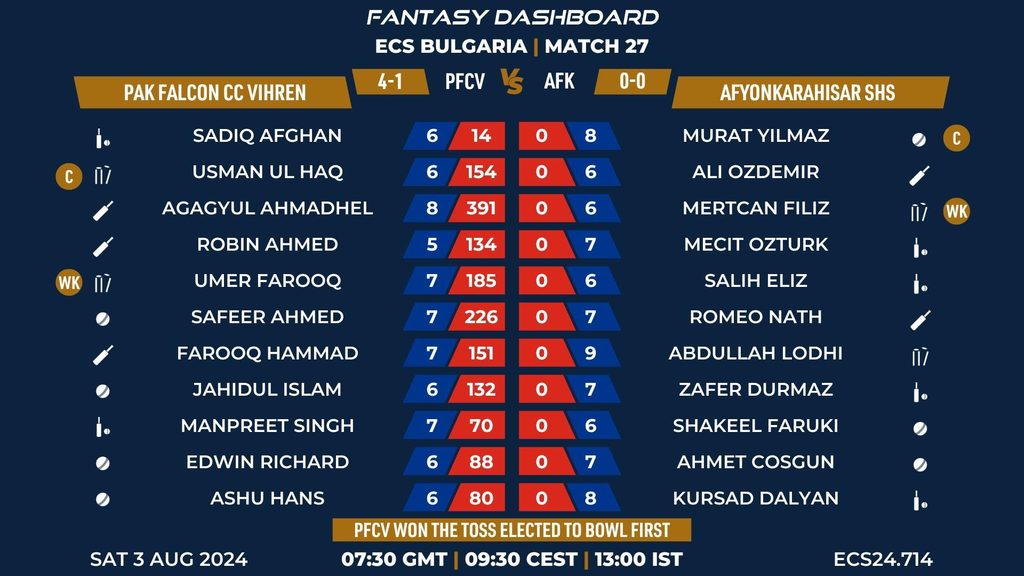 MATCH 27 (ECS24.714) PAK FALCON CC VIHREN vs AFYONKARAHISAR SHS 07:30 GMT | 09:30 CEST | 13:00 IST