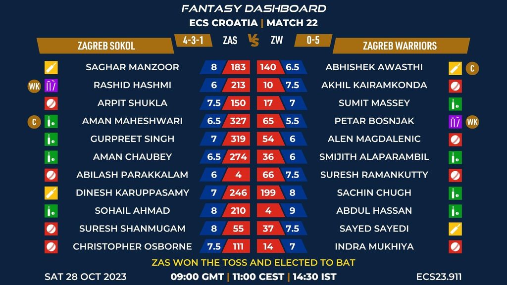MATCH 22 (ECS23.911) ZAGREB SOKOL vs ZAGREB WARRIORS 09:00 GMT | 11:00 CEST | 14:30 IST