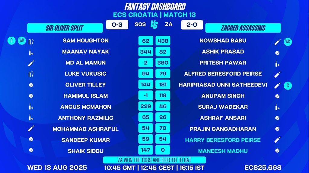 With Zagreb Assassins’ superior win percentage and a deep roster of match-winners, they enter as slight favourites. However, Sir Oliver Split’s in-form stars ensure this contest is wide open. Expect a high-scoring, action-packed encounter at Mladost Cricket Ground!