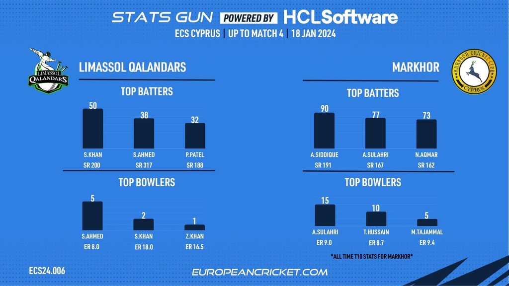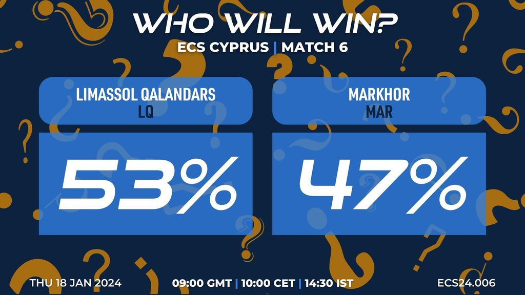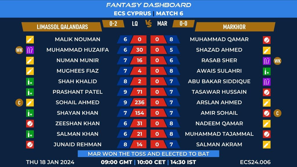 MATCH 6 (ECS24.006) LIMASSOL QALANDARS vs MARKHOR 08:45 GMT | 09:45 CET | 14:15 IST
