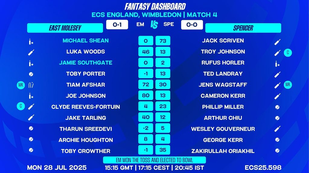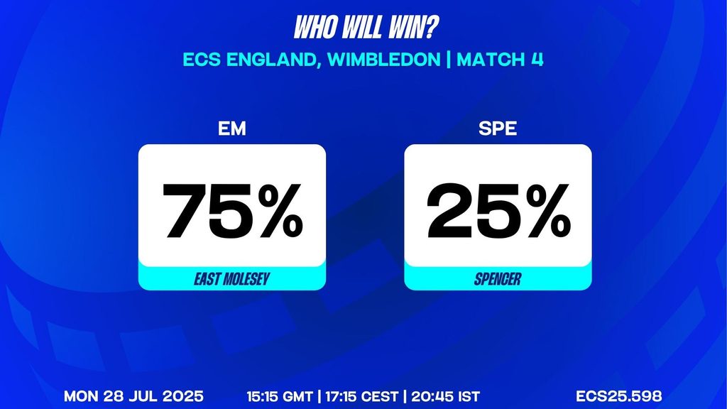 As the ECS England, Wimbledon, 2025 continues to deliver high-octane T10 action, all eyes turn to Match 4 of Group A, where East Molesey (EM) take on Spencer (SPE). With both teams eager to stamp their authority early in the tournament, individual brilliance could well decide the outcome. Here are the players to watch, based on career and event data: