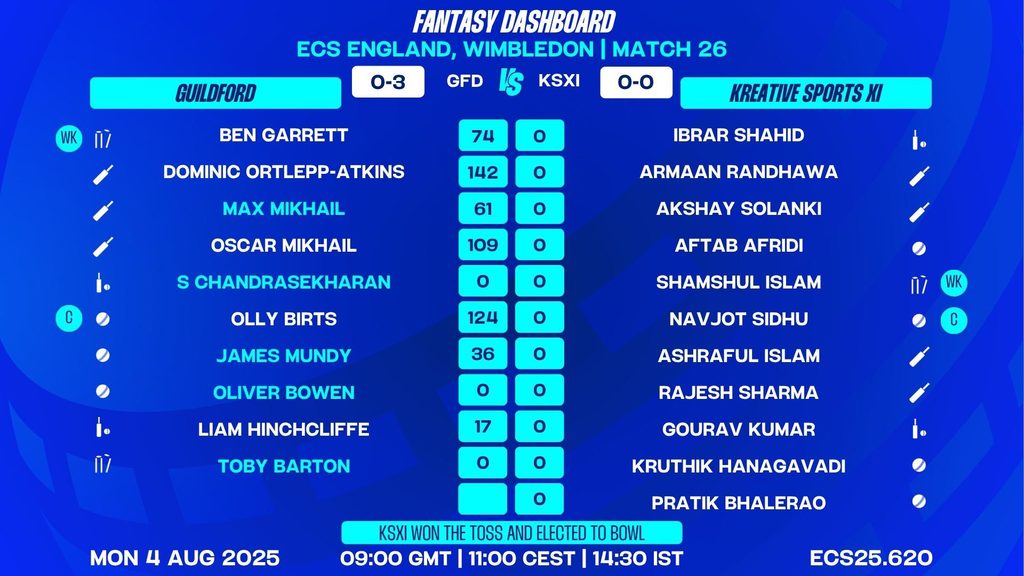 With both teams fielding a mix of emerging and established talent, Match 26 promises to be a high-octane contest. Kreative Sports XI, led by the in-form Ashraful Islam, appear to have the edge on paper, but Guildford’s young guns, especially Dominic Ortlepp-Atkins and Olly Birts, are more than capable of causing an upset. Expect fireworks at Raynes Park Sports Ground as these two sides battle for crucial Group B points in the ECS England, Wimbledon, 2025.