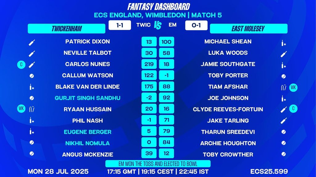 With East Molesey opting to field first, expect fireworks from the Twickenham top order, but Luka Woods and the EM lineup have the firepower to chase down any total. The T10 format rewards aggression and all-round skills, making this a must-watch contest for fans and fantasy players alike.