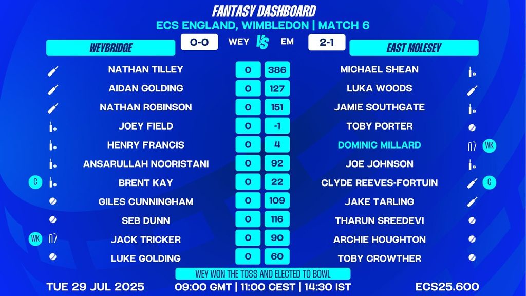 As the ECS England, Wimbledon, 2025 continues to deliver high-octane T10 action, all eyes turn to Match 6, where Weybridge (WEY) take on East Molesey (EM) in a crucial Group A encounter. With Weybridge opting to field first, the stage is set for a dynamic contest at Raynes Park Sports Ground.