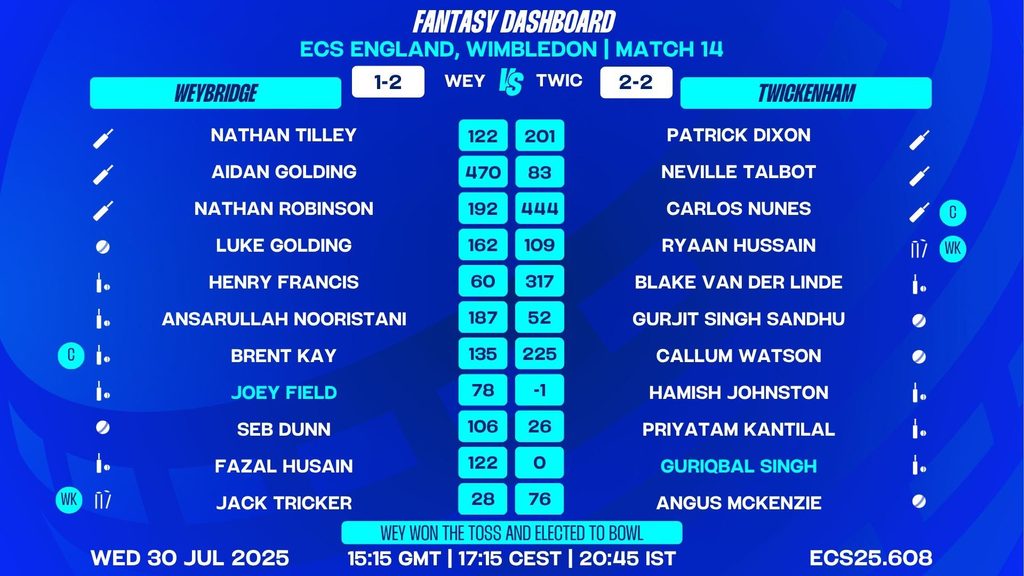 With both teams boasting match-winners and fantasy goldmines, ECS England, Wimbledon, 2025 Group A Match Day 3 Match 14 promises to be a high-octane contest. Weybridge will look to their star all-rounder Aidan Golding to deliver, while Twickenham’s depth and experience, led by Carlos Nunes and Blake van der Linde, make them formidable opponents. Expect fireworks at Raynes Park Sports Ground as these two sides vie for crucial points in the group stage.
