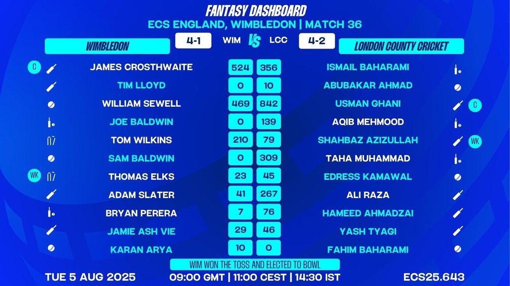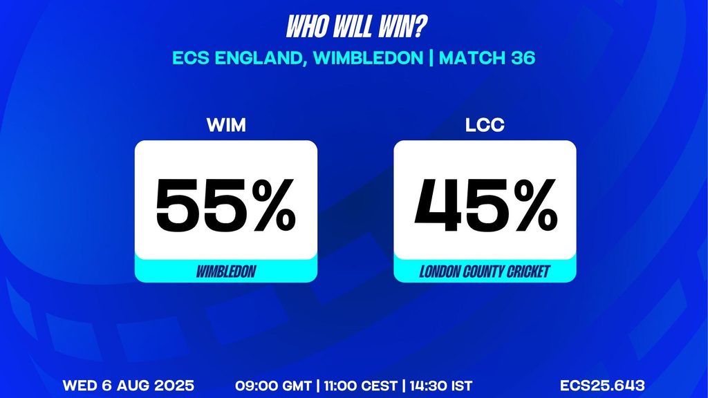 With both teams boasting strong records and match-winners, ECS England, Wimbledon, 2025 Group B Match Day 4 Match 36 promises to be a high-octane T10 clash. The battle between Wimbledon's consistency and LCC’s explosive firepower, led by Usman Ghani, will be the key narrative. Expect fireworks at Raynes Park Sports Ground as these two sides vie for supremacy and crucial group points.