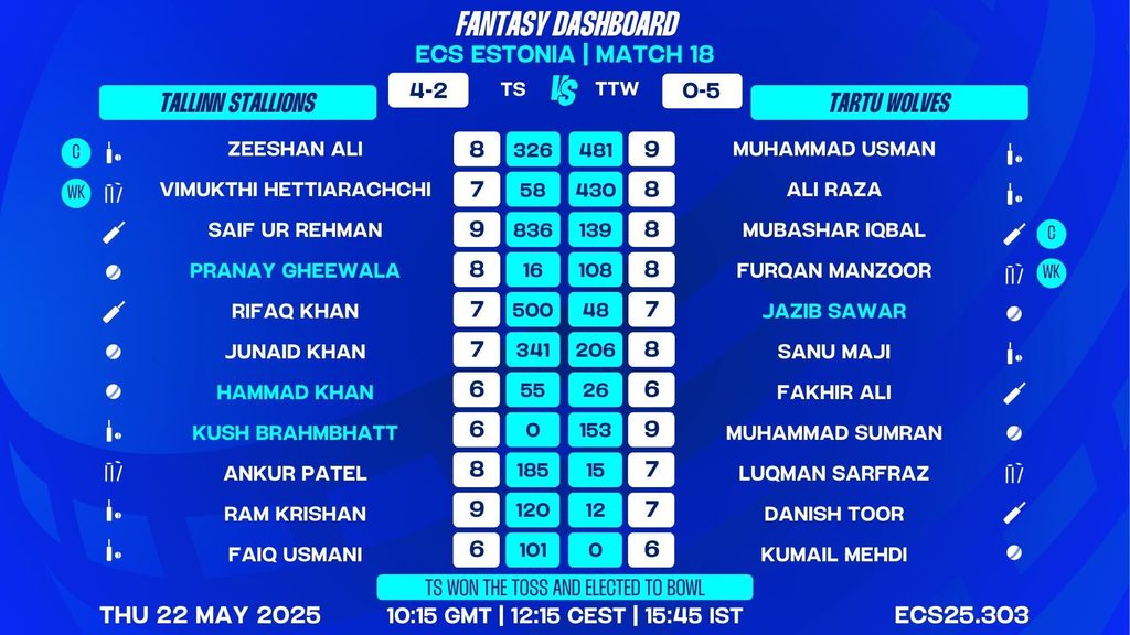 MATCH 18 (ECS25.303) Tallinn Stallions vs Tartu Wolves 10:15 GMT | 12:15 CEST | 15:45 IST