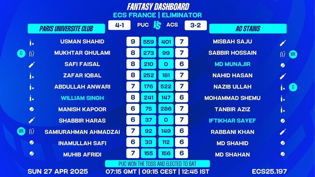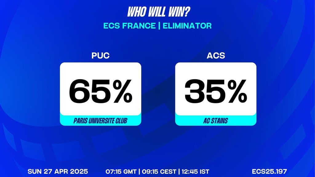 ELIMINATOR (ECS25.197) Paris Universite Club vs AC Stains 07:15 GMT | 09:15 CEST | 12:45 IST