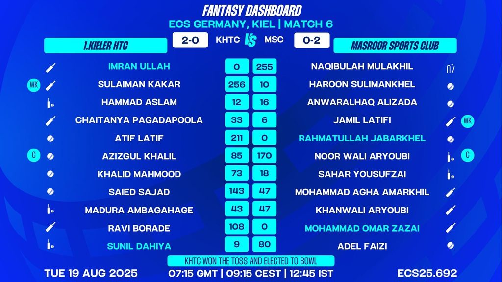 With both teams boasting explosive batters and impactful all-rounders, ECS Germany, Kiel, 2025 Group A Match Day 2 Match 6 promises to be a high-octane contest. KHTC’s strong win record and depth will be tested by MSC’s in-form top order. Fantasy managers and fans alike should keep a close eye on the key players highlighted above, as their performances are likely to shape the result at the Kiel Cricket Ground.