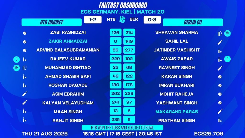 With both teams fielding dynamic all-rounders and big hitters, Match 20 of the ECS Germany, Kiel, 2025 promises to be a high-octane contest. HTB Cricket, having won the toss and chosen to field, will look to their in-form stars to restrict Berlin CC, who in turn will bank on their experience and depth. Expect fireworks at the Kiel Cricket Ground as these two sides battle for crucial Group B points!