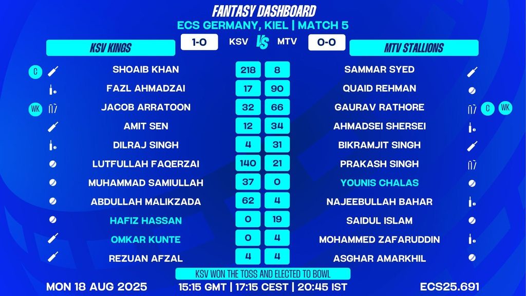 With both teams boasting strong records and match-winners, this Group A clash at the ECS Germany, Kiel, 2025 promises to be a high-octane T10 encounter. Expect fireworks from the KSV Kings’ all-rounders and a spirited challenge from the MTV Stallions’ experienced core. Fantasy managers and fans alike should keep a close eye on the key players highlighted above, as they are poised to make a significant impact on Match Day 1.