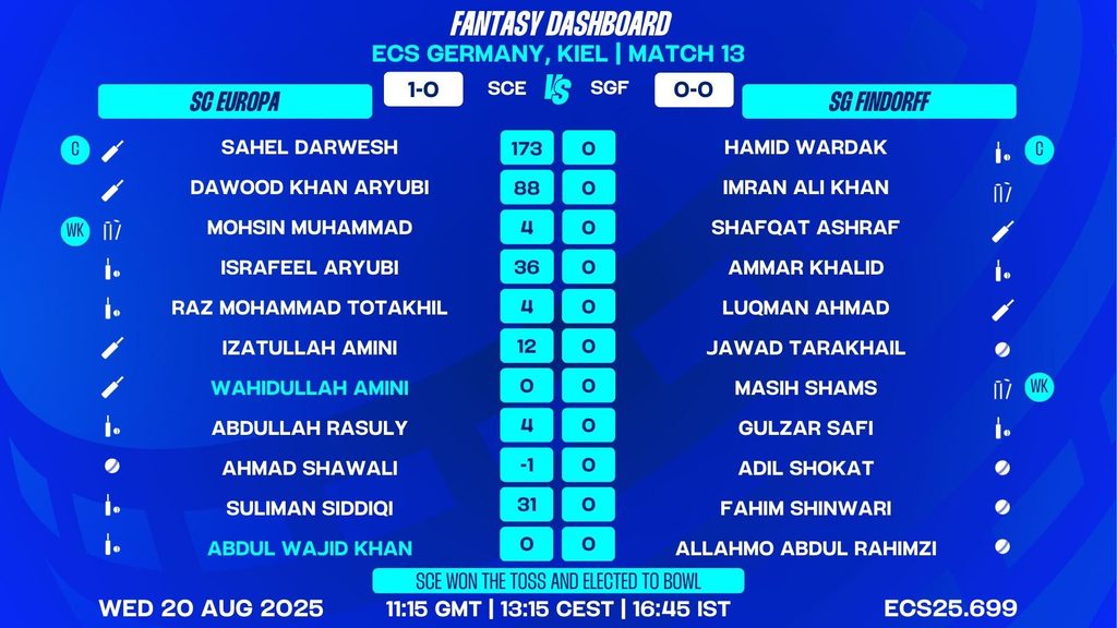 With SC Europa electing to field first, expect early fireworks from SG Findorff’s top order, especially from Ammar Khalid and Hamid Wardak. SC Europa’s bowling, led by Wahidullah Amini, will be crucial in containing the SGF batters. The match promises high-octane action, with several all-rounders and power-hitters on both sides ready to make a decisive impact. Fantasy managers and fans alike should keep a close eye on the key matchups and be prepared for a thrilling contest at the Kiel Cricket Ground.