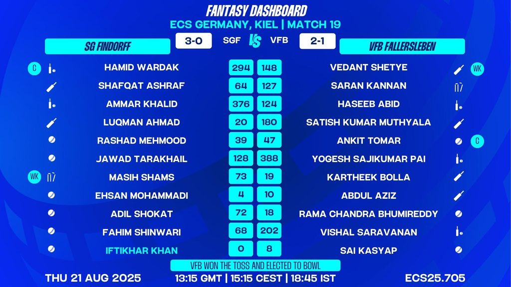 With SG Findorff’s dominant form and VFB Fallersleben’s hunger to climb the table, Match 19 promises high-octane action at the Kiel Cricket Ground. Expect fireworks from the all-rounders and a contest that could go down to the wire. Stay tuned for a T10 thriller!