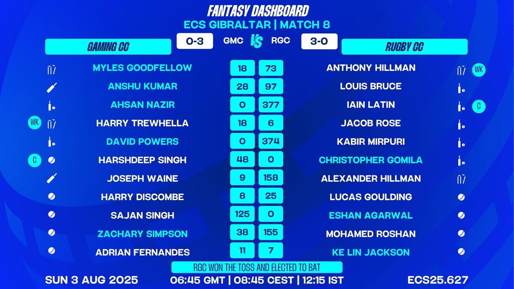 With Rugby CC’s firepower and Gaming CC’s hungry young squad, Match 8 of ECS Gibraltar, 2025 is set for a thrilling contest. Expect big hits, quick wickets, and plenty of fantasy points on offer as both teams vie for supremacy at the Europa Sports Complex.