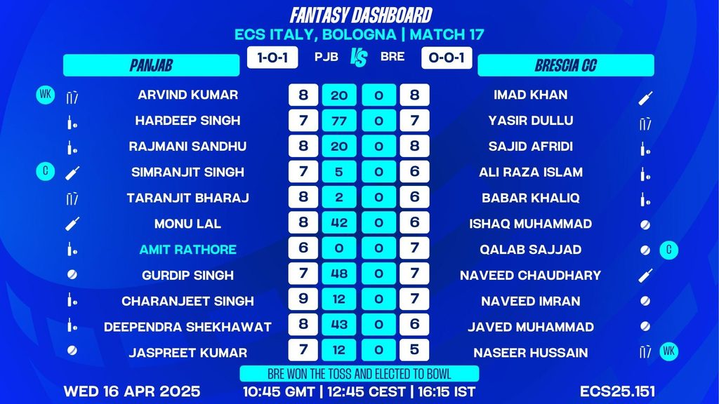 MATCH 17 (ECS25.151) Panjab vs Brescia CC 10:45 GMT | 12:45 CEST | 16:15 IST