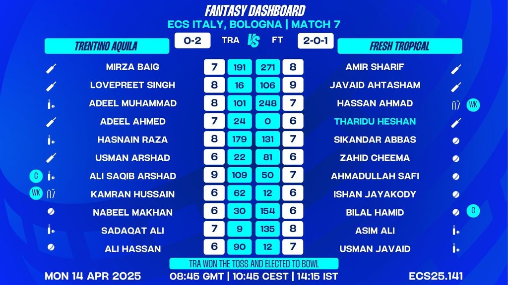 MATCH 7 (ECS25.141) Trentino Aquila vs Fresh Tropical 08:45 GMT | 10:45 CEST | 14:15 IST
