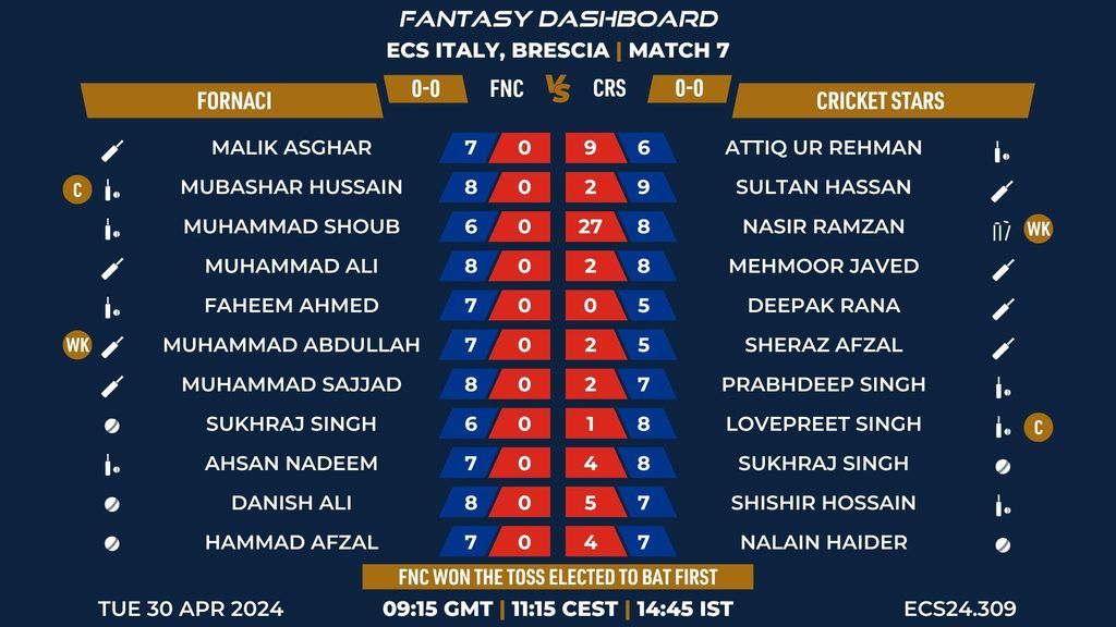MATCH 7 (ECS24.309) FORNACI vs CRICKET STARS 09:15 GMT | 11:15 CEST | 14:45 IST