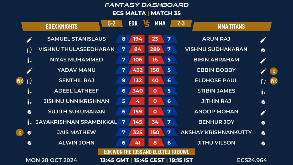 MATCH 35 (ECS24.964) EDEX KNIGHTS vs MMA TITANS 13:45 GMT | 15:45 CEST | 19:15 IST