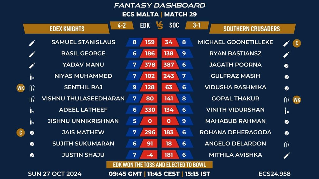 MATCH 29 (ECS24.958) EDEX KNIGHTS vs SOUTHERN CRUSADERS 07:30 GMT | 09:30 CEST | 13:00 IST